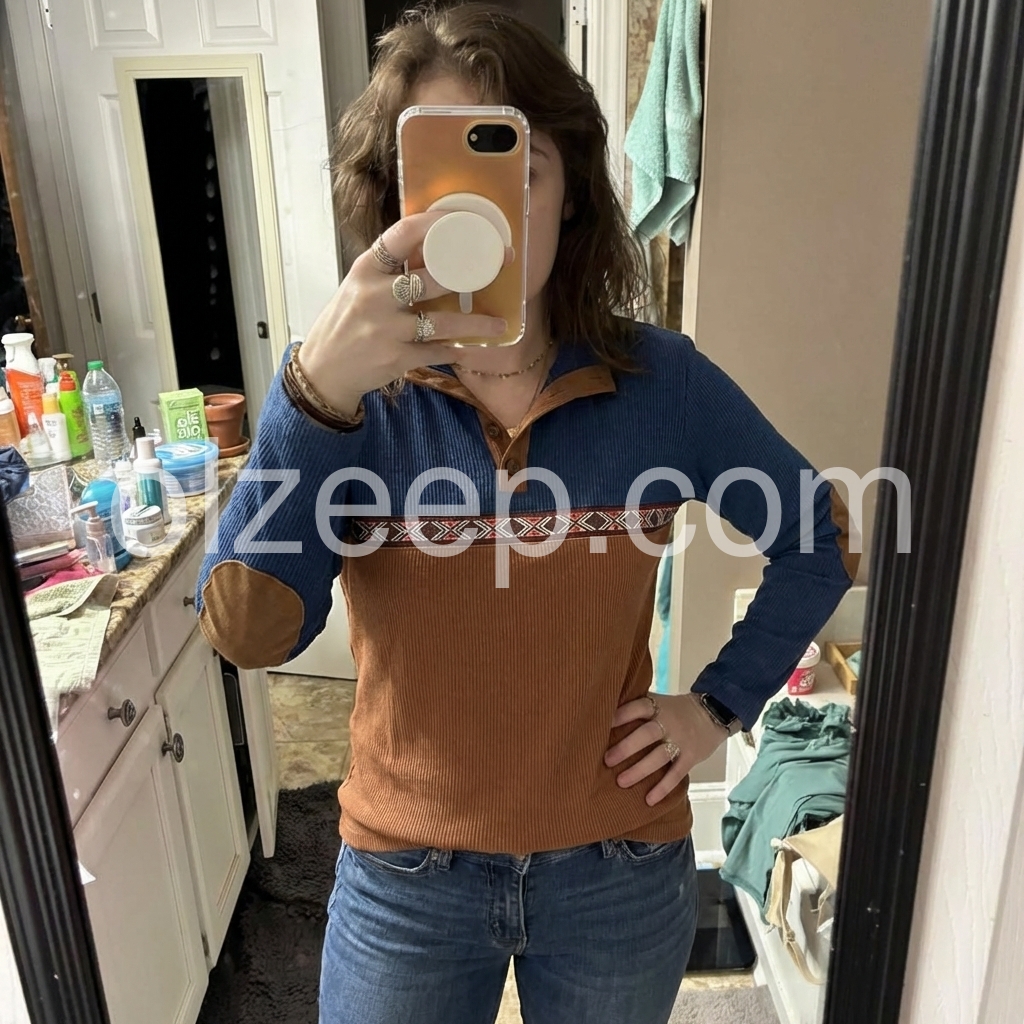 This top is cute. It’s a kind of a thin material. The sizing is true to size, the fabric is soft and comfortable. For size reference, I’m about 135 lbs, 5ft 2in tall, my bra size is 34D, I typically wear a 6 or 8 in jeans and a medium in tops, and I got this in a size medium.