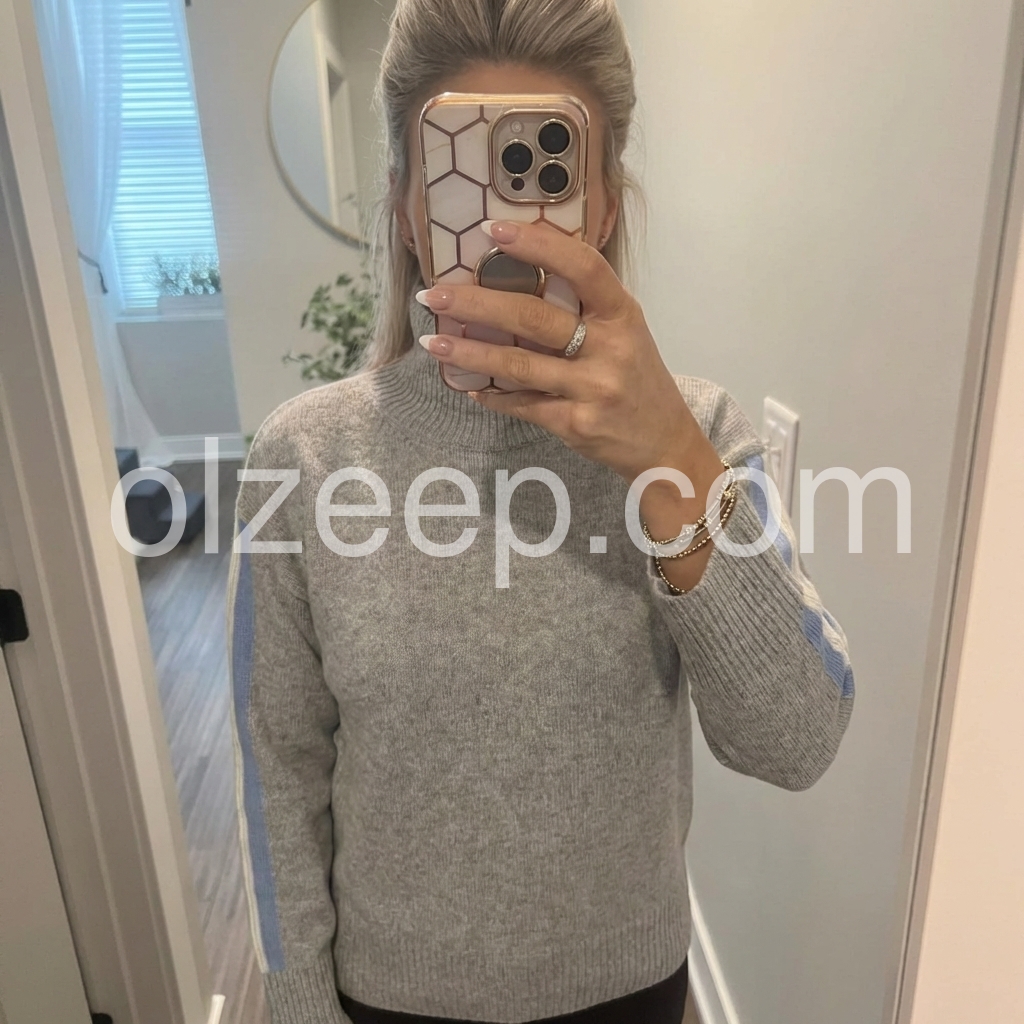 When I first received this grey sweater I wasn't sure if I liked it. One I tried it on I did like it. It fits well and I liked the design of the sweater. I like the high-neck, which isn't too cold. The sweater is comfortable and lightweight for cool days. I think it is a good value for the price.
