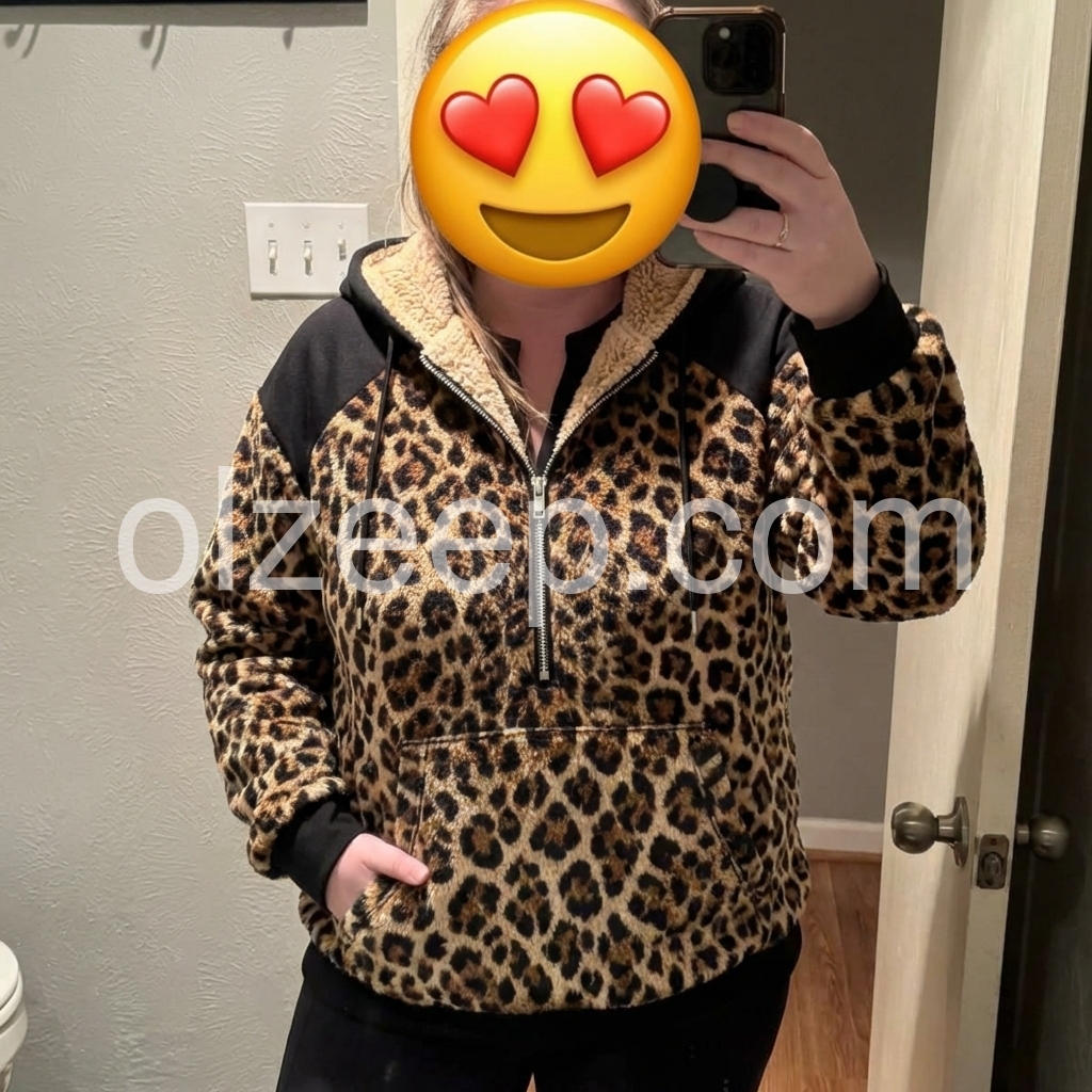 I absolutely love this hoodie! The leopard print is bold but still stylish, and the black base makes it feel super wearable. The zip-up design with the cozy sherpa lining around the hood and front is such a nice touch warm and flattering. I’ve worn it a few times already and it still looks fresh and high-quality.