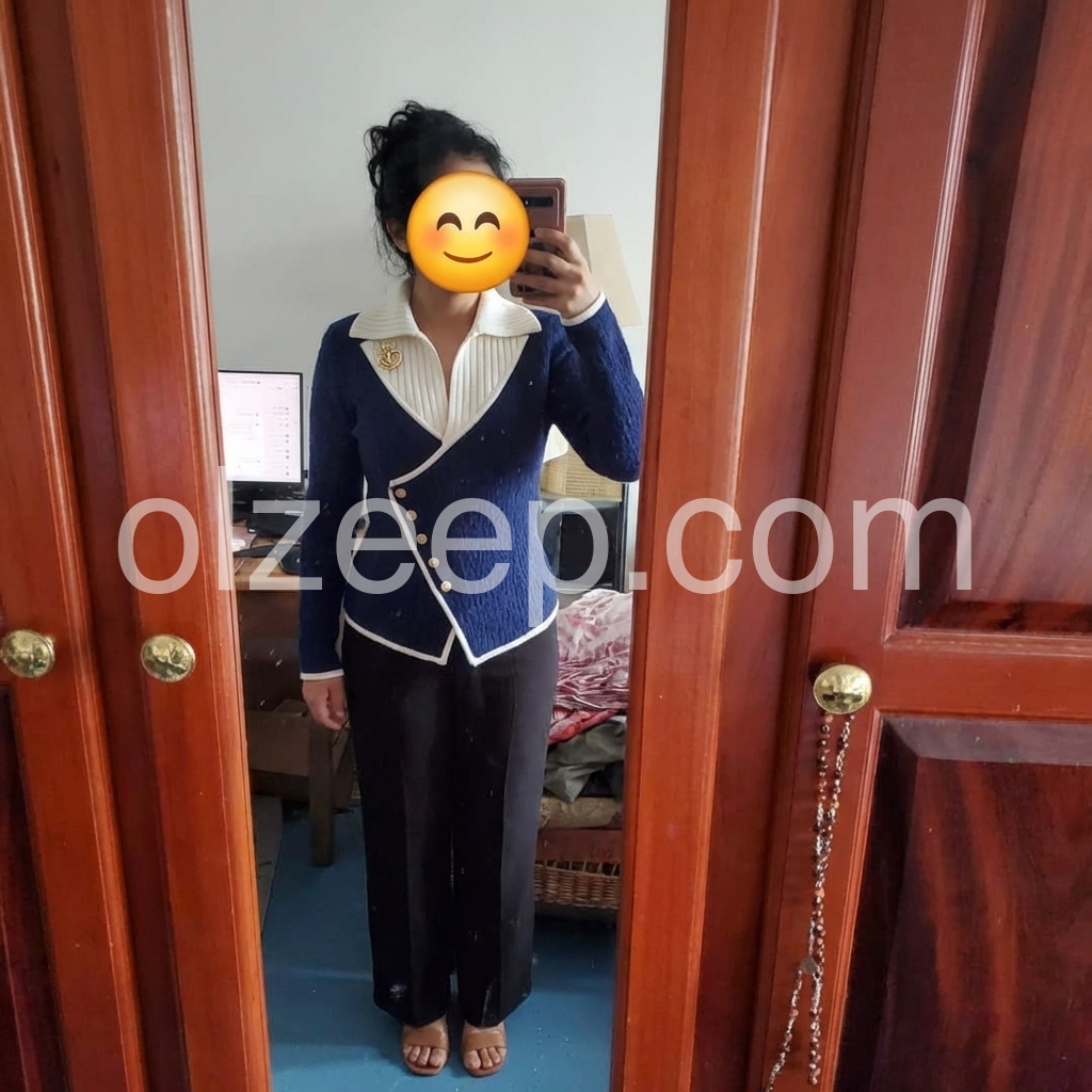 This sweater is stunning. The navy tone looks sophisticated, and the cream collar gives a clean, elegant contrast. I love the subtle details—especially the button placement and the way the design frames the neckline. It looks like something you’d see in a high-end boutique. Great quality and great style.